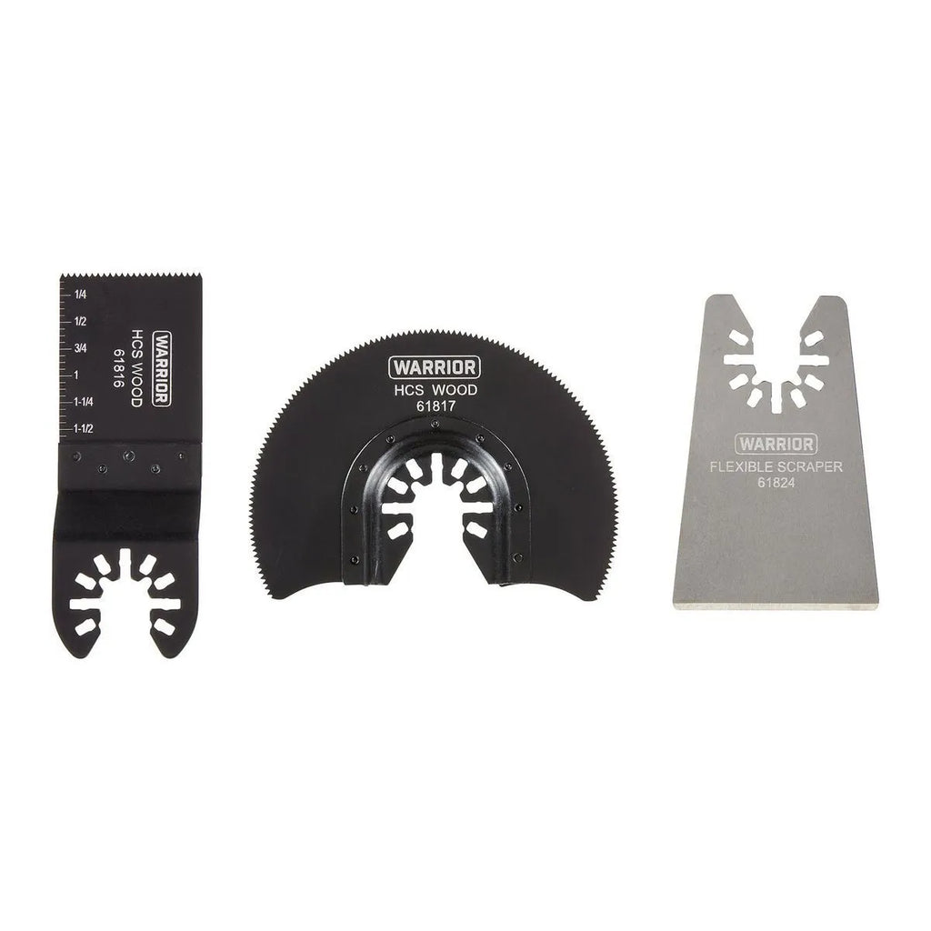 Este juego de hojas para herramienta multifuncional oscilante WARRIOR® incluye 3 hojas duraderas que se acoplan fácilmente a tu herramienta multifuncional oscilante para una variedad de trabajos de corte y raspado.