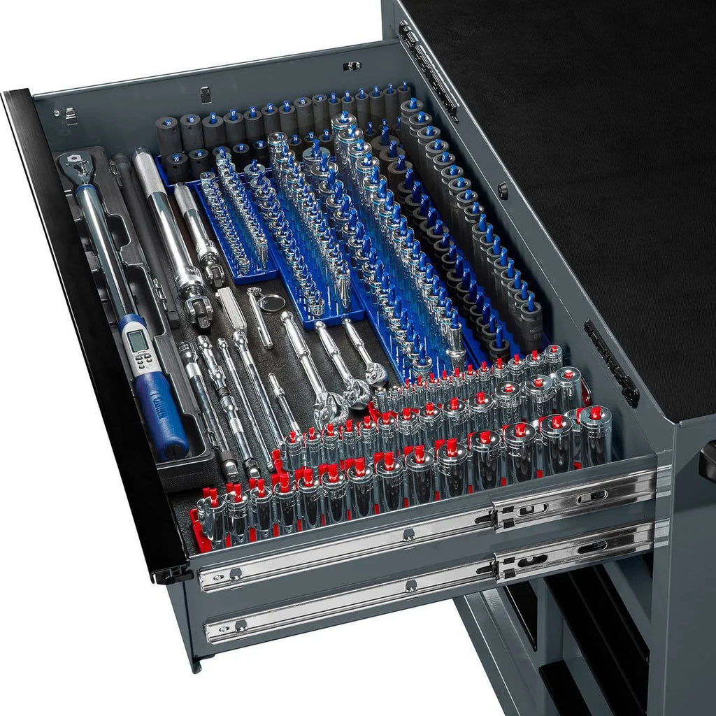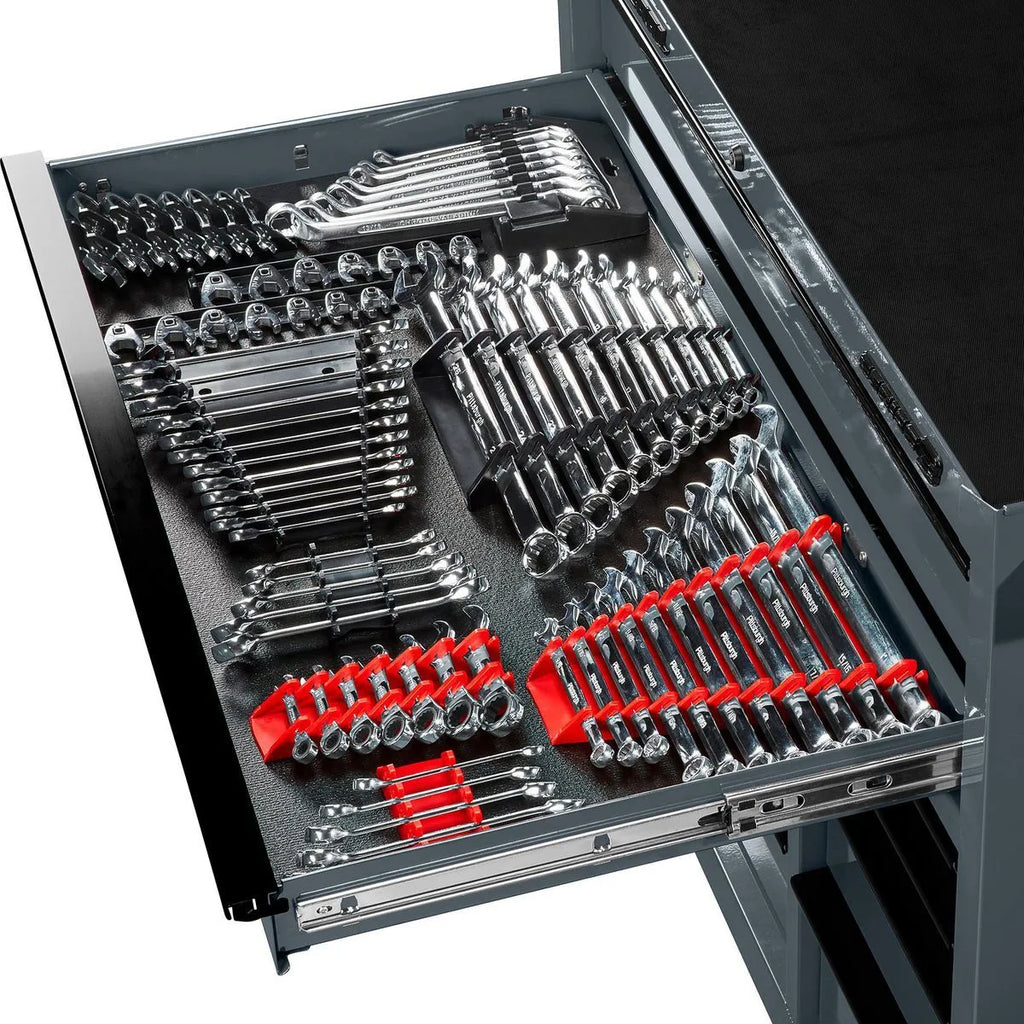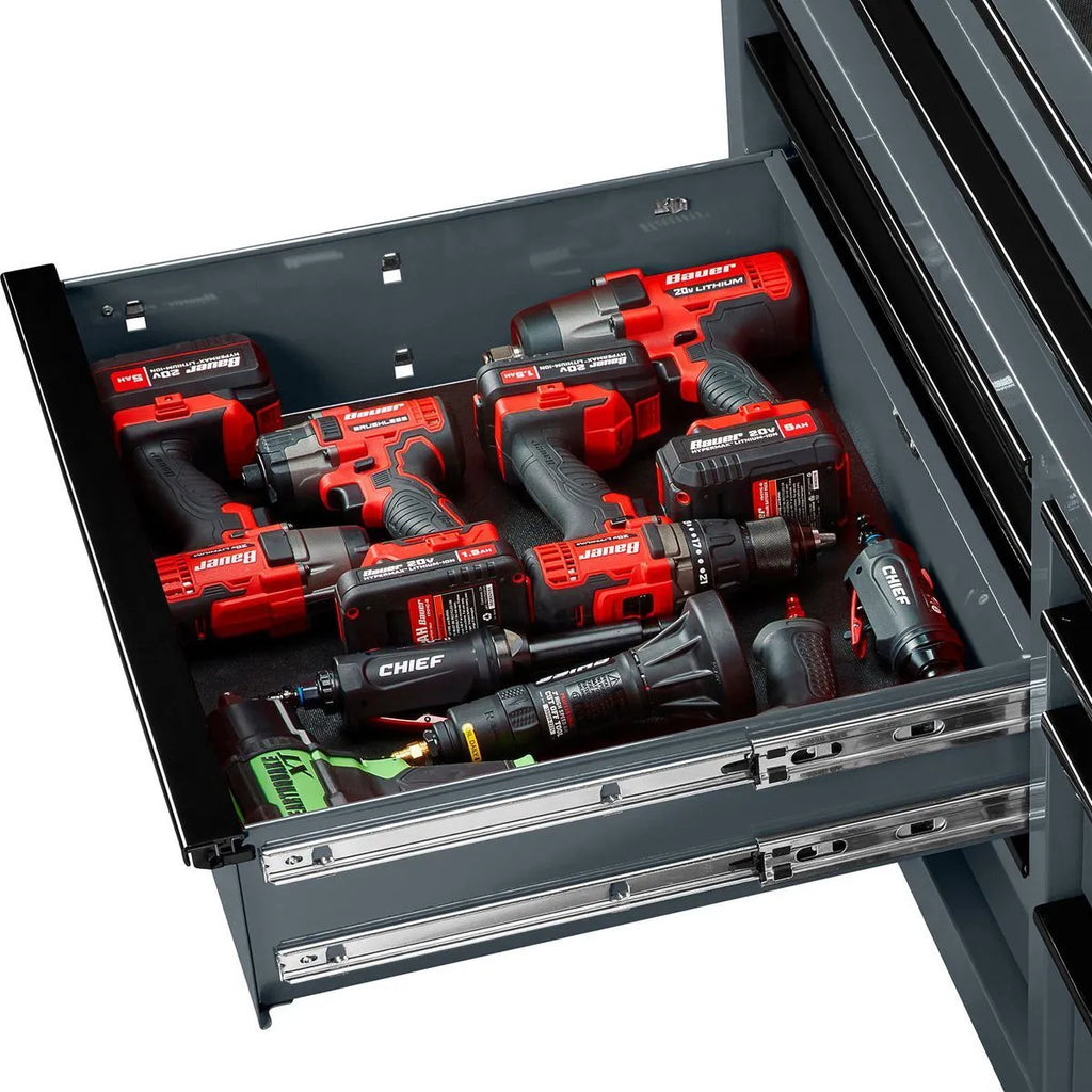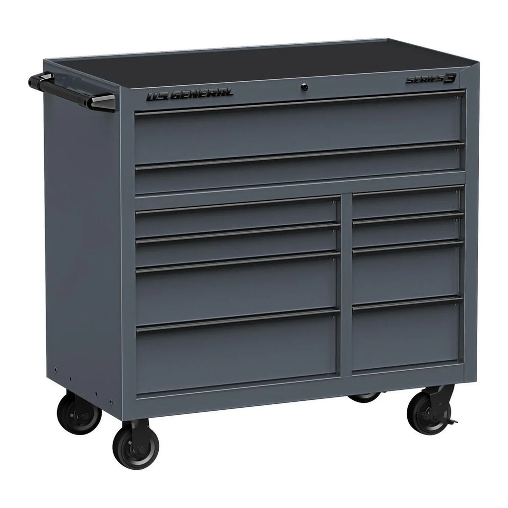 La línea de almacenamiento de herramientas U.S. GENERAL® Serie 3 es totalmente modular para ofrecer infinitas combinaciones de almacenamiento que se adapten a sus necesidades. El 42 pulg. Roll Cab amplía sus capacidades de almacenamiento con 16.700 cu. pulg. de espacio y una capacidad de peso de 2600 libras. Cuenta con 10 cajones con pestillos de ancho completo, forros de cajón precortados y una sola cerradura de barril integrada. Los duraderos rodamientos de bolas de extensión total y el resistente acabado con recubrimiento en polvo hacen que este almacenamiento sea perfecto para el garaje de su casa o el taller de automóviles.