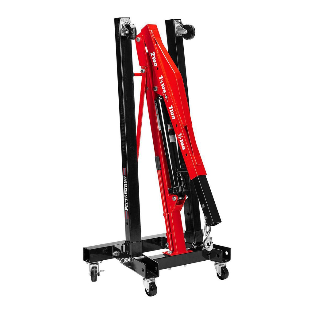 Esta grúa de taller plegable con capacidad de 4000 lb (2 toneladas) ofrece la potencia de elevación que necesitas, combinada con la ventaja de un almacenamiento compacto. Las ruedas giratorias con doble rodamiento permiten un desplazamiento suave y sencillo por tu área de trabajo. La grúa incluye cilindro hidráulico, cadena y gancho.